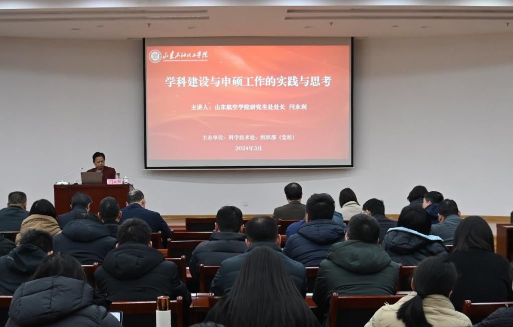 为凝聚学科发展共识,深化学科建设内涵,全面推进学校学科建设高质量发展,3月9日,党委组织部、科学技术处共同举办“突破提升”专题培训班首场讲座,邀请山东航空学院研究生处处长闫永利作学科建设专题报告。全体中层干部、党政管理机构科级干部、党支部书记、二级学院系(室)主任、学术带头人、学科骨干等150余人参加培训。